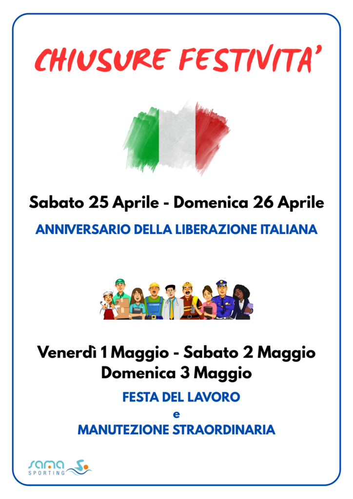 Di seguito troverete i giorni di chiusura per le festività del 25 Aprile e 1 Maggio 2026.