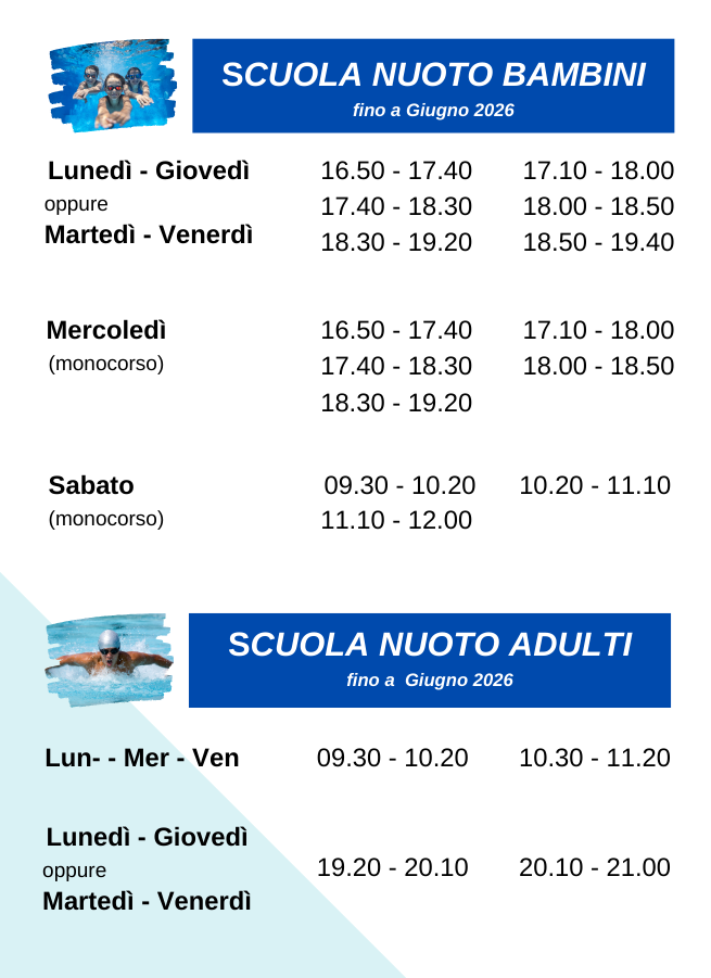 | Size: 88 KB 28-01-2026 Orari Ginnastica posturale e Postural-Pilates | Size: 40 KB 28-01-2026 Orari Circuit training | Size: 55 KB 28-01-2026 Orari Acquagym | Size: 268 KB 28-01-2026 Orari Mamme e piccoli | Size: 148 KB 28-01-2026 Orari Scuola nuoto bambini ed adulti | Size: 73 KB 28-01-2026 Orari Nuoto guidato | Size: 228 KB 28-01-2026 Orari Scuola di Danza